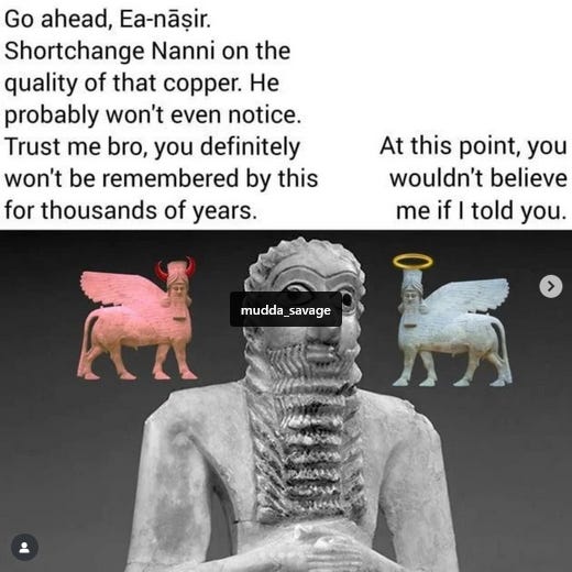 Comparações esdrúxulas, mas didáticas: sumérios “clássicos” estão para os impérios babilônico e assírio mais ou menos como estiveram os gregos clássicos para os romanos. Ou seja, eram um povo visto como “tendo sido”. Foi grande um dia, o maior um dia, o mais inteligente um dia, mas foi conquistado. Os romanos que se apaixonaram pela cultura do “grego clássico” de um Platão eram os mesmos que viam seus gregos contemporâneos como inferiores. E algo semelhante a esse complexo de admiração/inferioridade (pelos de antes) e desprezo (pelos de agora) aconteceu com os sumérios também.